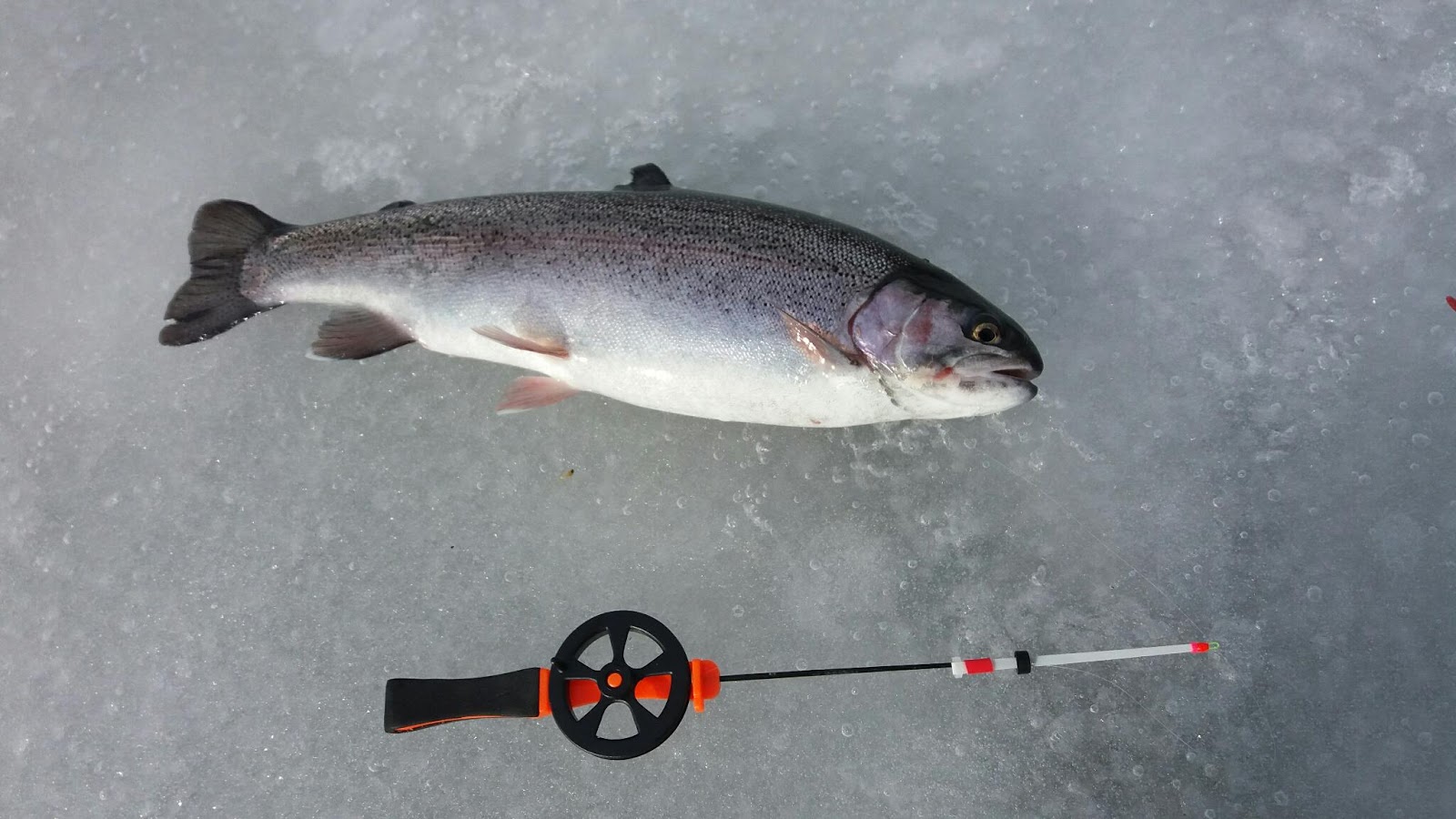 Idag åkte jag å Sjögga till ett nytt vatten för mig, han var här förra helgen o drog 2 fina bågar då. Isen var fin att gå på men det var lurigt runt gamla hål o vi satte oss vid ett bäck utlopp me öppet vatten. Det tog inte så lång tid innan jag fick en fin båge på en röd mormyska o djupet var bara 2-3 meter, den for runt en bra stund innan vi kunde lägga den på isen. Sedan var det lugnt en lång stund men vi flyttade på oss till en vik där de har fått röding förut. Det var ganska djupt men inga hugg så vi bytte plats igen och jag provade på djupet c:a 24 meter och fick en mindre röding direkt. Sjögga gick över mot en udde som såg fin ut och när jag kom fram till honom drog han upp en röding. Själv gick jag över på andra sidan udden där var det lite grundare och såg fint ut men inga hugg. Vi lallade tillbaka mot utloppet igen men det var bara en stöt på mitt spö så vi packade oss hemåt. Fint ställe som jag kommer att besöka fler gånger då man oxå kan använda flytring där.